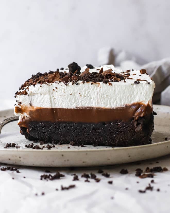 Oreo cookie crust + brownie + chocolate pudding + whipped cream = heaven.